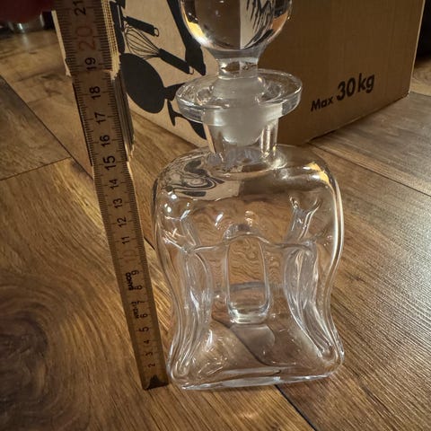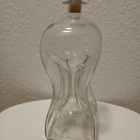Denne klukflaske af klart glas er repareret, og kan fungere til dekoration.