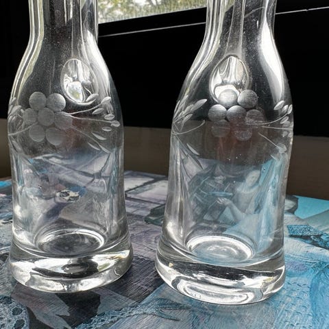 2 Matterede glas flasker med prop, til olie og eddike.