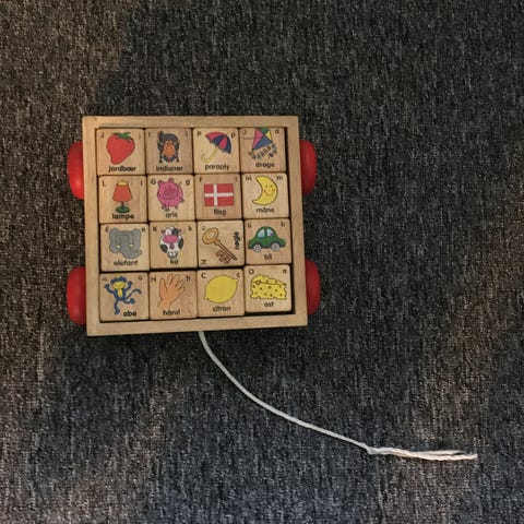 Trækasses med forskellige former huller til sortering af træklodser Den har farvede kanter: grøn, blå, rød.,Afhentes i:,Røde Kors Glostrup (161),Bemærk at mail, chat og beskeder ikke besvares, og varen skal købes på knappen "Gå til varen"