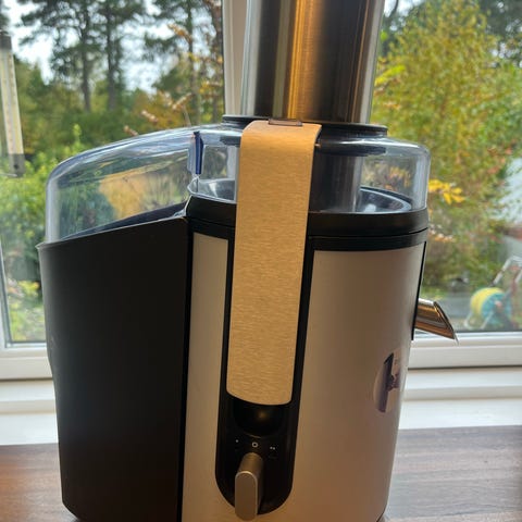 Philips saftpresser i sort plast med tilhørende beholder og tilbehør. Designet til effektiv udvinding af juice fra frugt og grøntsager. Strømkabel tilsluttet for elektrisk drift.