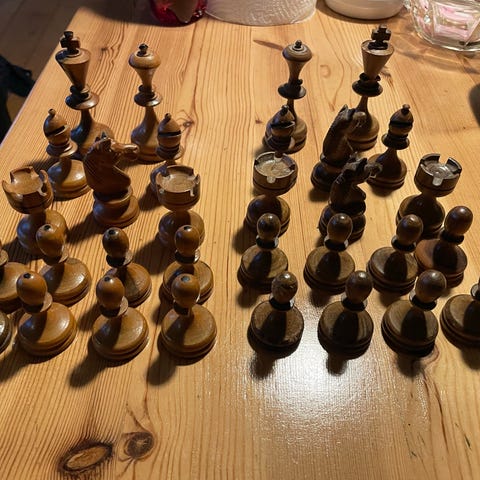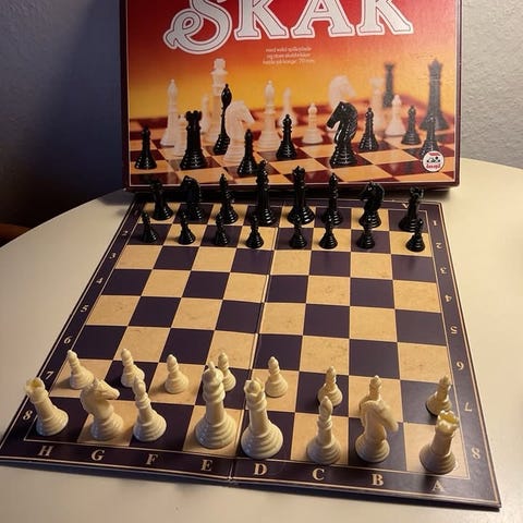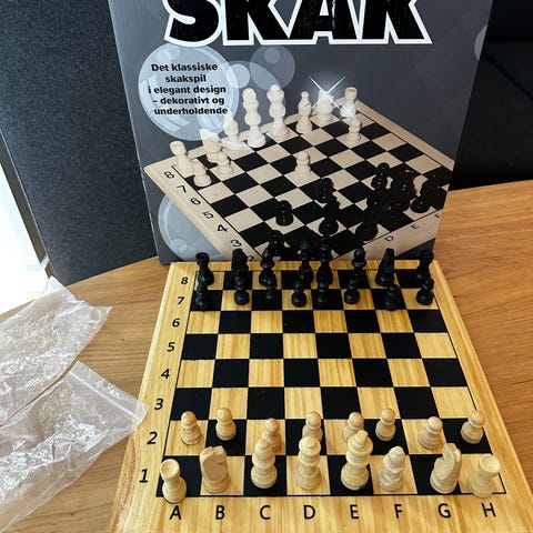 skakbræt med træskakbrikker i sort og naturfarvet træ. Sættet indeholder alle standard skakbrikker og et bræt i kraftig pap