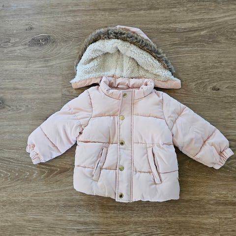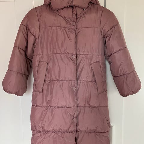H&M vinterjakke til piger i størrelse 152. Jakken er sort og har fleeceforethætte. Den er designet til at give varme og komfort i koldere vejrforhold. Jakken har en justerbar snor i taljen og knaplukning ved den aftagelige hætte.