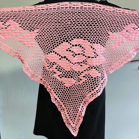 Flot håndarbejde i en sort og en rød tråd (ikke uld) breden er ca. 250 cm højden er ca. 110 cm.