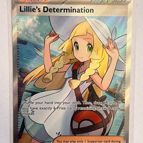 Pokémon Lillie's Determination special illustration rare (SIR). Kortet er en del af Pokémon Trading Card Game og bruges til spillet. Kortets størrelse er standard for Pokémon-kort.