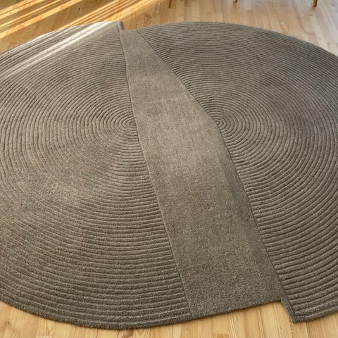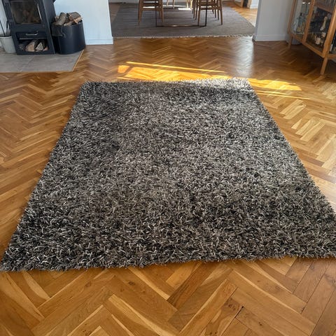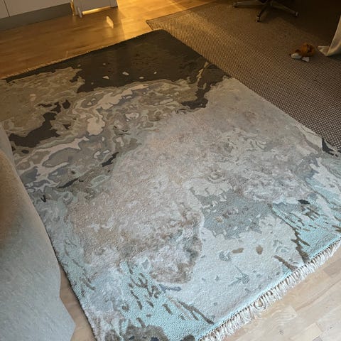Bæredygtig ægte tæppe fra Bolia i blå, lyserød og beige. Tæppet fremstår uden brugs tegn, ingen pletter eller skader. Tæppet er fra dyr/ røg frit hjem.