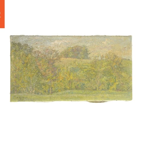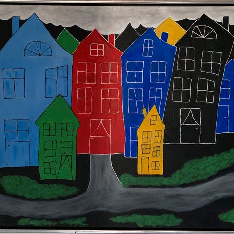 Dette er et maleri af en dansk landsby, der viser en gade med traditionelle huse og en lys himmel. Maleriet er sat i en træramme med en gylden finish. Det har en størrelse på 50x42 cm og kan hænges på væggen ved hjælp af den medfølgende wireramme bag på. Maleriet har en signatur i nederste venstre hjørne, hvilket kan indikere kunstnerens navn. Muhlbach