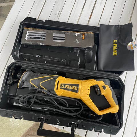 Ældre brugbar bajonetsav med mange klinger i metalkasse.