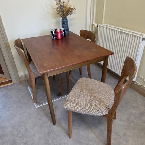 Meget pænt spisebordssæt i massiv teak i høj kvalitet. Bordet har et rids (se bildener). Der kommer en 50 cm ekstra plade med.