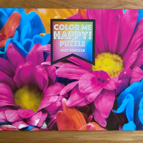 Puzzle med blomstermotiv bestående af mange små brikker i forskellige farver, herunder nuancer af orange, pink og blå.