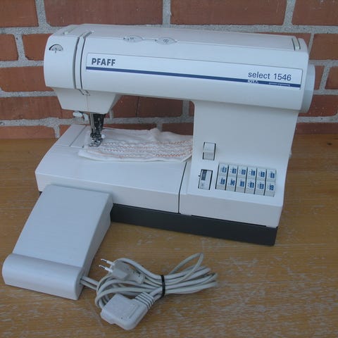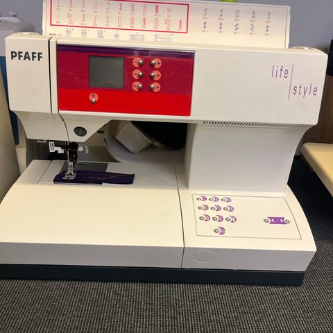 Pfaff Creative 2124 symaskine med flere funktioner og tilbehør. Maskinen har indbygget lys, digitalt display og forskellige syprogrammer. Leveres med fodpedal og brugervejledning.