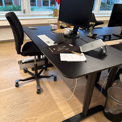 IKEA Bekant elektrisk hæve sænkebord i sortbejdset asketræsfinér med afrundede hjørner og synlig årestruktur. Højden kan justeres fra 65-125 cm. Små brugsspor på bordpladen men ikke noget man lægger mærke til. Byd gerne:) Afhent selv på østerbro