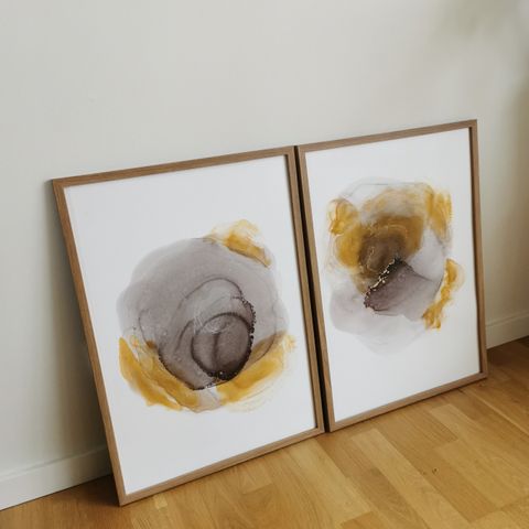 Smukke, originale malerier i et poetisk, abstrakt udtryk. Farvepaletten bevæger sig i blå, grønne og lyse nuancer med teksturelle lag og fine detaljer, der giver hvert værk en følelse af dybde og bevægelse.