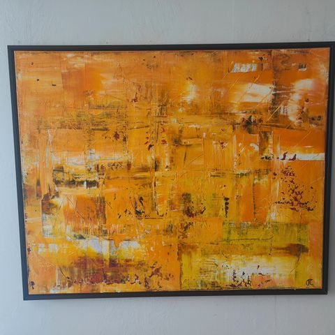 Sæt bestående af 7 abstrakte malerier med farverige og dynamiske mønstre. Malerierne varierer i størrelse og er indrammet. Velegnet til vægdekoration i bolig eller kontor. Farveskemaet inkluderer nuancer af rød, grøn, blå, orange og sort.