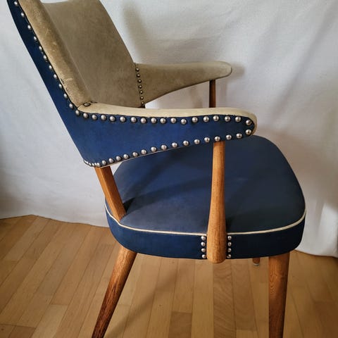 Vintage blå frisørstol/lænestol med armlæn, dekorative nitter og ben i træ.