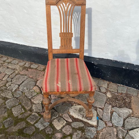 Højrygget barok stol af egetræ, udskåret med acanthusbladværk,Sæde og ryg med sømbeslået nyt læder, cabriole forben med dyrepoter med udskåret tvær ornament.