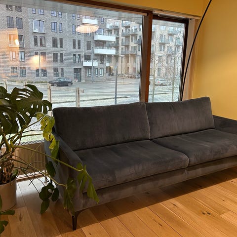 Sofaen har faste, men behagelige hynder, og betrækket er både slidstærkt og nemt at holde.