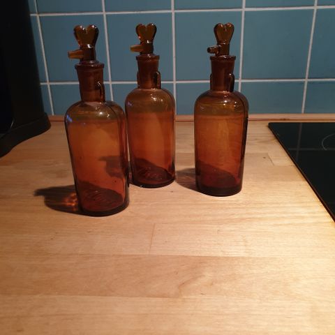 Antikke Ravfarvede apoteker flasker i top stand Alle 3 meddrejet prop og alle slebet i 8 kantet form