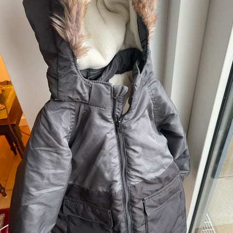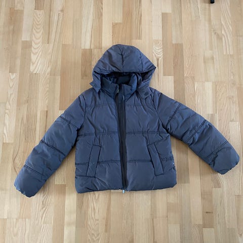 H&M Vinterjakke til dreng i størrelse 110. Jakken er grøn og har en hætte med pelskant. Den er foret med blødt materiale indvendigt for ekstra varme og komfort.