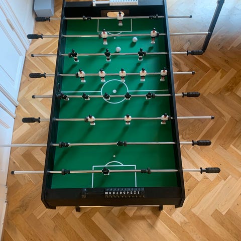 Ældre bordfodbold lavet af mørkegråt træ. Mærket der står indeni er Sport craft. Alt virker og er der er ingen fejl eller mangler at se. Bolde medfølger. Jeg har skilt det ad så det er klar til afhentning. Kom med bud, skal hentes hurtigst muligt.