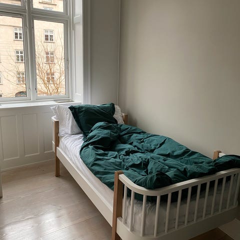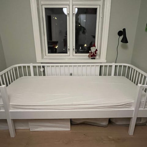 Sengen har nærmest ikke været sovet i, men stået inde på værelse. Der er lidt "ridser i lakken", som jeg vil mene kan skjules med lidt maling.