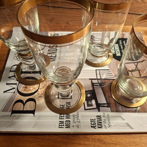 Holmegaard glas med guldkanter, bestående af 5 ølglas og 2 rødvinsglas.