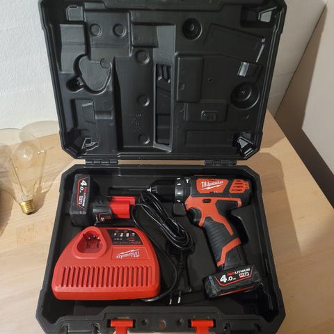 Milwaukee bore skruemaskine. klar til brug i kuffert med 3 stk 1,5 Ah batterier og oplader — perfekt til både mobil og stationær anvendelse. helt nyt aidrig brugt. har købt den i juli. kvittering haves.