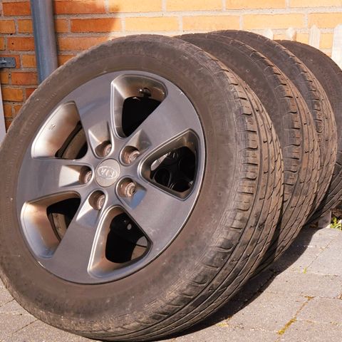 4 stk originale Kia alufælge med dæk, 2 har været inde over en chikane, (ve for og baghjul) derfor den lave pris.