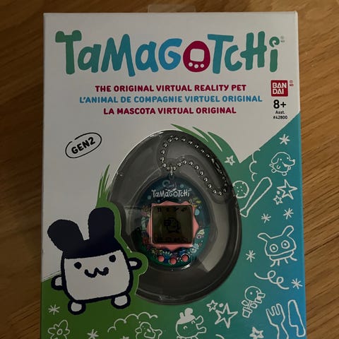 Tamagotchi digitalt kæledyr nøglekæde i blå og pink farve. En lille elektronisk enhed med LCD-skærm og kontrolknapper til pleje af et virtuelt kæledyr. Enhederne har kuglekæde til nem ophængning. Batteridækslet kan åbnes for batteriskift.