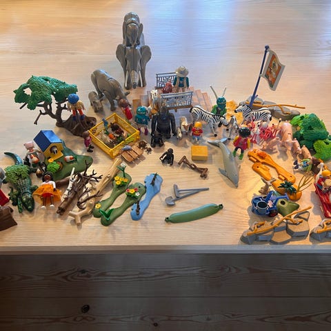 hjemmelavet mini Zoo i træ, L 35 cm x 24 cm med tilbehør fra Playmobil, bl.a. 2 marsvin, 3 hjorte, 3 køer, 2 stinkdyr, 2 pindsvin, 2 ænder, 3 høns, 2 kaniner, 3 får samt mad og 2 personer og en trillebør, træer m.m.