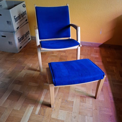 Super lækker lænestol med ryg der kan lænes tilbage i kirsebærtræ og kvadrat uld betræk i turkis blå incl fodskammel der kan åbnes til evt blade og briller eller andre småting . Ingen skader på træet men man kan selvfølgelig se lidt på betrækket at stolen er blevet brugt . Desuden har den indstillelig nakkepude .