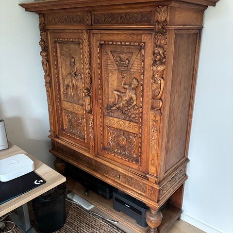 Antik barok træskab med detaljerede, udsmykkede paneler og udskæringer. Skabet har en mørk træfinish og er konstrueret i massivt træ. Designet indeholder geometriske mønstre på dørene og dekorative elementer øverst. Skabet er velegnet til opbevaring i stuer eller spisestuer og har en robust og solid konstruktion.