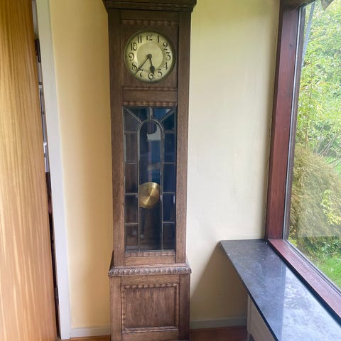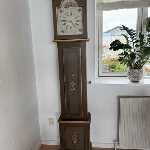 Antik Gulur Grandfather Clock i træ med hvid og guld finish. Uret har en klassisk rund urskive med romertal og pendul.