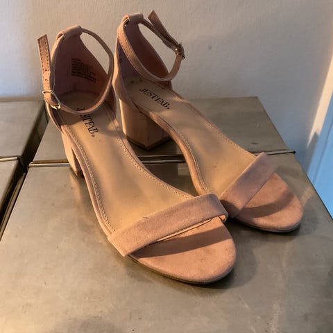 Et par sandaler med hæl fra JustFab, i modellen 'Spencer' og en støvet rosa farve. De har et lille plateau og en bred blokhæl, hvilket gør dem meget behagelige at have på og gå i, på trods af den 15 cm høje hæl. Sandalerne har lange flettede stropper fastgjort bagpå, der kan vikles og bindes om benet. Hvis du vil se dem i brug, kan du bare google 'JustFab Spencer' og se produktbilleder ☺️ De er brugt gange lidt, måske en eller to gange indendørs og har kun mindre tegn på brug, som vist på billederne, men har ingen mærkbar slidtage på sålerne og er generelt i god stand. Mærkatet i bunden er flyttet op lige bag hælen, fordi det er det eneste sted, hvor model og størrelse var angivet på dem.