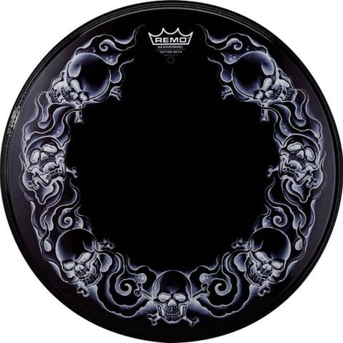 Remo Powerstroke 3 Bass 22" Tattoo Skyns. Hvidt med sorte skulls. Bemærk, at reifen er sort. Helt nyt i uåbnet emballage.