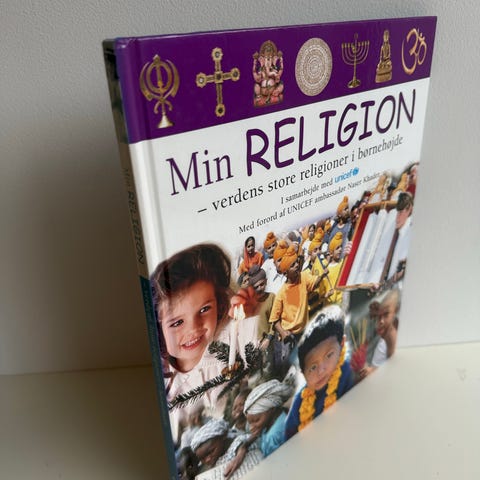 Religion i Øjenhøjde bog med sort omslag og tekst på forsiden. Bogen indeholder information om religion og er egnet til undervisning eller personlig læsning.