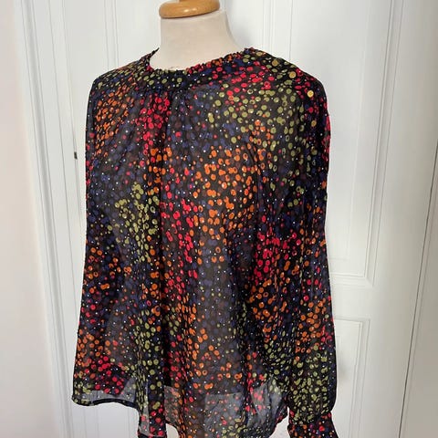 Sød og fræk bluse med 'lyn og skyer' som motiv. Delvis gennemsigtig, så fint at have udover top eller anden bluse. Brugt men i god stand. Jeg har klippet str. ud, men mener det er en M. Vasket uden skyllemiddel og fra røgfrit hjem. Køber betaler porto.