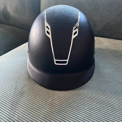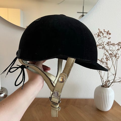 Horka ridehjelm i sort farve, størrelse 6 7/8 (56 cm). Hjelmen er certificeret efter EN1384 sikkerhedsstandard. Den har stropper til fastgørelse under hagen.