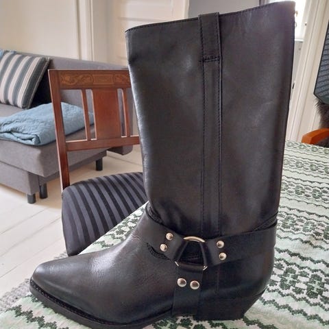 Westernstyle🤠 støvletter i sort lækkert blødt skind. Med sølvnitter og sølvkappe på front. Med lynlås på indersiden. Flot stand og kun brugt meget lidt ser det ud til. Ingen brugsspor indeni. Hælhøjde 4.5 cm. Sort skindfoer så de vil holde faconen rigtig godt. Str 39. Nypris 1600 kr. Du kan loppesjoppe dem for 600 kr.