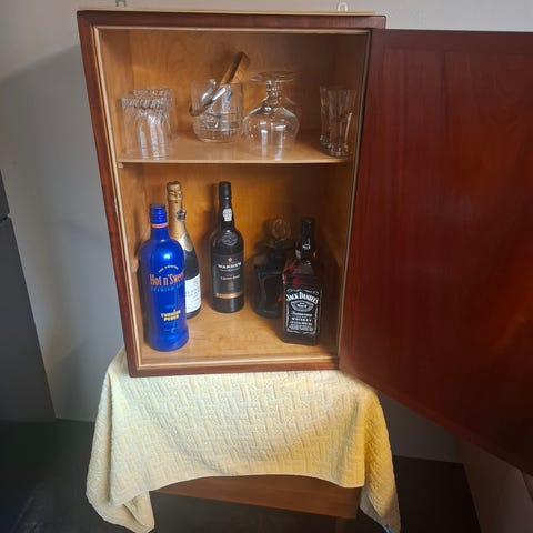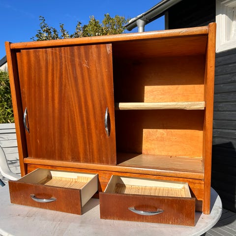 Lys latte farvet og hvidt inden i. Der har været påsat ben. Kan tilkøbes for yderligere 200 kr af mig. Skabet måler 100x58 uden ben. Kan også hænge på væggen. Befinder sig i 3540 Lynge. Nøgle mangler.