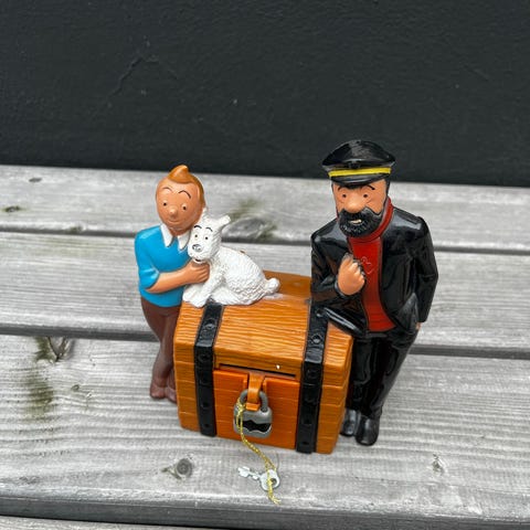 Diorama fra Rackham Den Rødes Skat, hvor Tintin og Kaptajn Haddock finder en skatkiste, mens Terry begejstret bjæffer med. I baggrunden ligger skibet Sirius, mens vandet bølger og palmerne svajer - lidt.