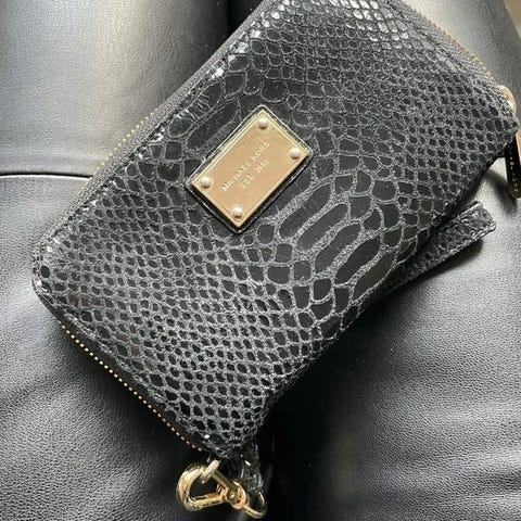 Lille clutch i imiteret slangeskind fra Michael Kors, med lynlås, plads til både kort og lille telefon. Aftagelig hank