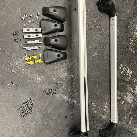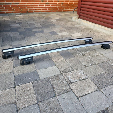 Hyundai Tagbøjler i aluminium med sort finish, designet til montering på tagræling. Passer til biler med tagræling og bruges til at transportere ekstra last som cykler, ski eller bagage.