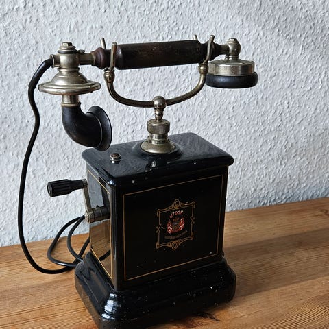 Vintage CB-telefon med håndsving og stofledning. Et charmerende retro-objekt med synlige brugsspor, let rust og patina, som gør den autentisk og unik. Perfekt som samlerobjekt eller som rekvisit til teater, film eller retro-indretning.