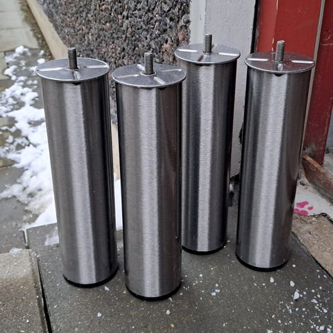 Sælger to pakker (i alt 8 stk.) helt nye og ubrugte Dunlopillo runde stålben i flot grå stål-look.