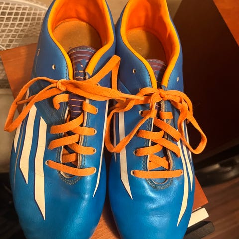Adidas F5 fodboldstøvler i blå og gul farve, størrelse 34, fremstillet i materialer egnet til udendørs brug. Designet til mænd, med knopper til græsbane.