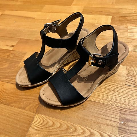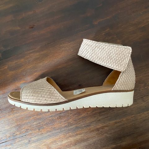 Meget sød med de røde blomster. Nem at gå i pga kilehælen