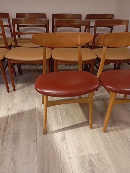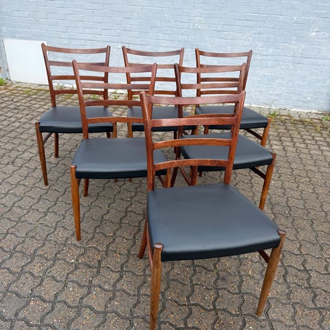 Stolene fremstår ny renoverede, limet i samlinger, så ingen løsheder, slebet og olieret, de har fået ny koldskum og er betrukket med sort kunstlæder, der kan købes læder fra 200 kr pr stol.
