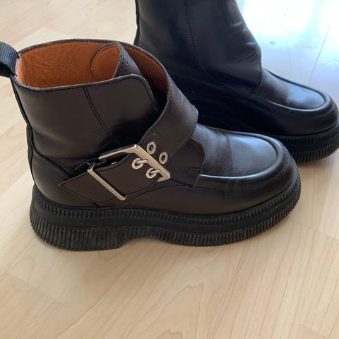 Ganni støvler i størrelse 39 til damer. Støvlerne er sorte og lavet af læder og elastiske materialer. De har en kraftig sål med mønster for bedre greb. Designet inkluderer elastik i siderne for nem påtagning og komfort.