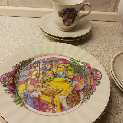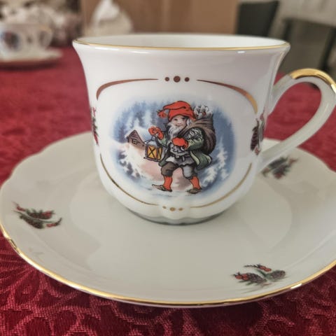 Gammeldags jul seriens kaffekop sæt -kage tallerken:17cm.underkop:13cm.kaffekop:7,3cm.højde:6,5cm.Motivet er designet af Lars Carlsson,viser en sød nisse med en lanterne og gaver,med pynt af Gran,kogler og røde bær,og med ægte guldkant.Er brugt med ingen skår,revner,meget lidt slid☕️🎄3-sæt for 250kr.