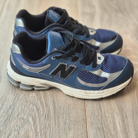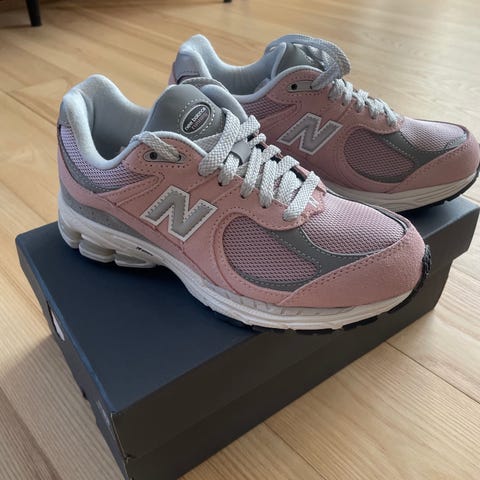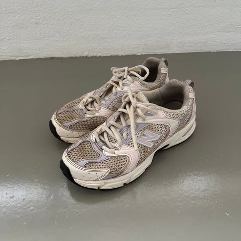 Sneakers fra New Balance i størrelse 38. Modellen hedder 997. De er mest i ruskind/læder i douche farver. Brugt et par enkelte gange (2-3 gange) og er i meget god stand. Jeg synes desværre at de var for store til mig og forsøgte med en anden sål - derfor har de ikke den originale indersål - men en almindelig hvid sål. Jeg kan ikke finde den originale indvendige. Købt i Danmark for DKK 750. Æske medfølger.